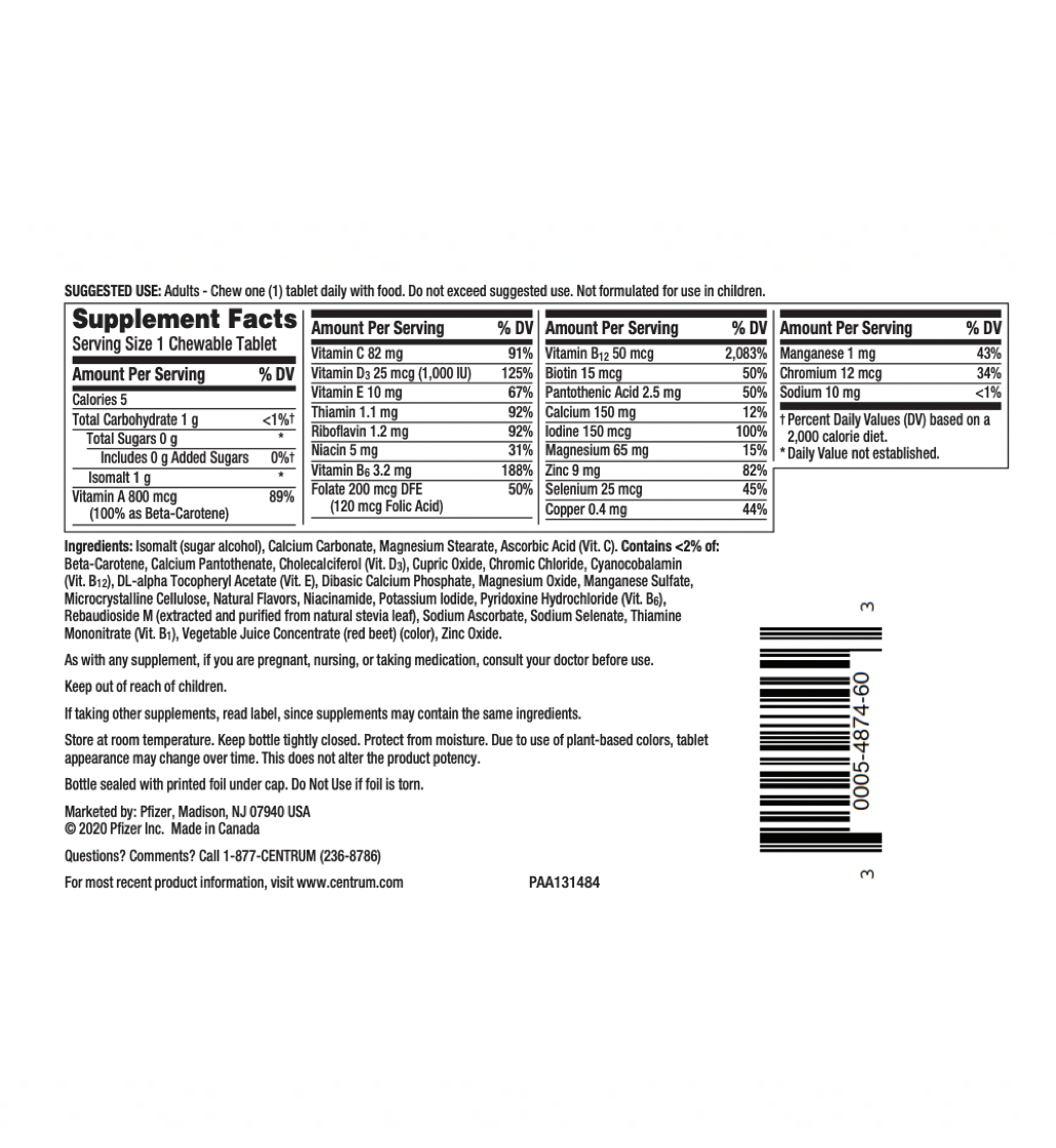 Trouble swallowing pills? Centrum Adults 50+ Fresh & Fruity Chewables makes it easier for adults over 50 to get the essential vitamins and minerals you need. This multivitamin supplement is specially crafted for healthy aging with high-quality ingredients to take care of your daily nutrient needs and support full body wellness.