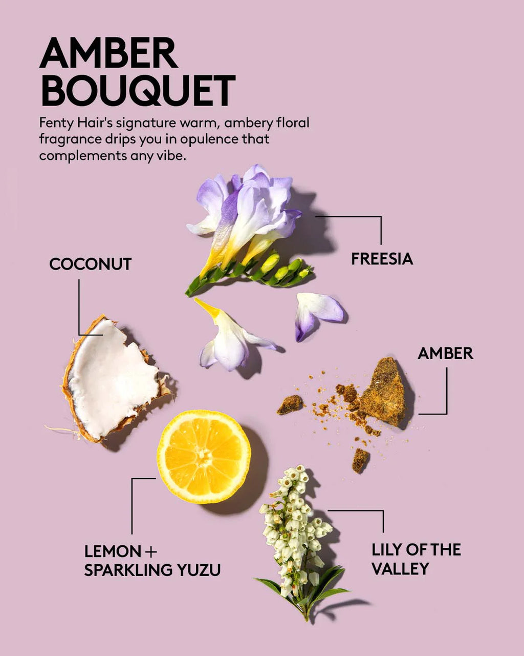 Fenty Hair’s signature fragrance drips you in notes of warm florals, amber, yuzu, coconut, vanilla + sandalwood.